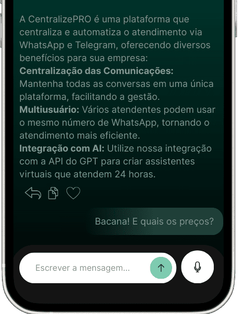 Quando bem configurada, a IA é extremamente segura. Os principais riscos envolvem respostas inadequadas por falta de treinamento ou configuração incorreta. Por isso, oferecemos o modelo humanizado Plus com supervisão contínua, filtros de segurança e possibilidade de intervenção humana a qualquer momento.